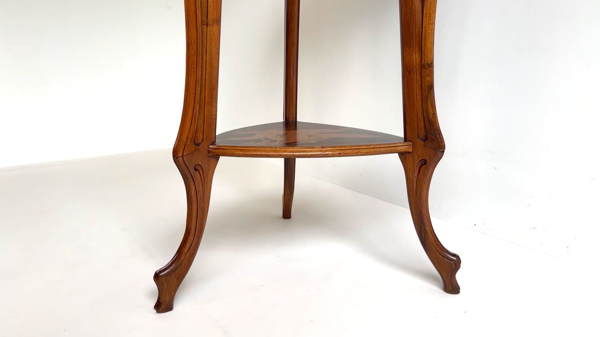 Gorgeous French Art Nouveau side table / gueridon by Emile Gallé model: Plate 162. Designed produced in 1905-1910. This is an antique original and not some reproduction. Amazing triangular model with 2 tiers of inlaid marquetry decorations depicting floral scenery of flowers, leaves and stems. This table incorporates naturalistic lines in its three legs, which branch off like flower stems. hand carved from solid walnut with superb details. The floral design of the base matches the scenery on the inlaid decoration, resulting in a gorgeous combination that is not only a piece of furniture but also a piece of art. The table top singed ''Gallé' in inlaid wood.